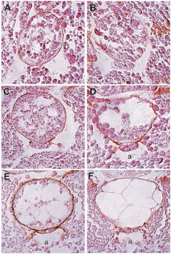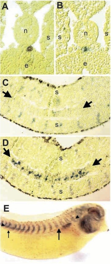 (C) Frontal section through the ventralnotochord (arrows) of a stage- 24 embryo. No VEGF expression is visible in the notochord cells. Anterior to the right. (D) Same embryo as C, showing VEGF expression in the cells of the endoderm immediately ventral to the notochord (marked by arrows). Anterior is to the right. (E) Whole- mount in situ hybridization for VEGF in the mature hypochord (arrowheads). Notice declining expression in the anterior portion of the hypochord (large arrow), while expression in the posterior portion of the hypochord remains abundant (small arrow). Prominent staining is also visible in the somite nuclei and the pronephros.