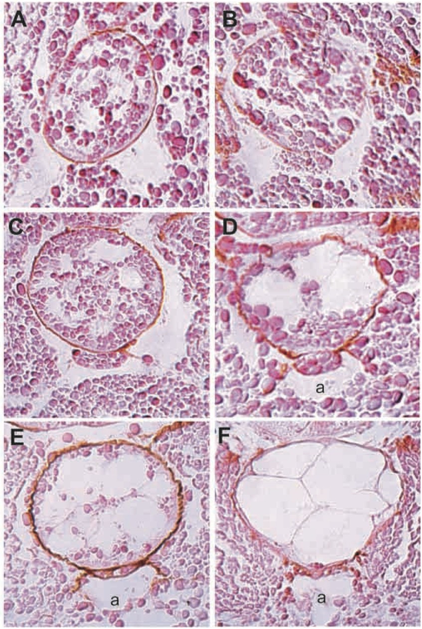 Fig. 2. Histological analysis of hypochord development. All sections are transverse sections through the trunk of the embryo posterior to the pronephric tubules and are stained using antibodies against Type II collagen and counterstained with Eosin. (A) Stage 26. Hypochord cells begin to delaminate from the dorsalmost endoderm. (B) Stage 28. Hypochord cells separate from the dorsal endoderm. (C) Stage 30. The hypochord lies adjacent to the ventral surface of the notochord and forms a mature organ. (D) Stage 34. The hypochord lies above the dorsal aorta (a) as circulation begins. (E) Stage 39. The hypochord begins to flatten significantly against the notochord.