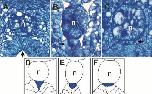 (C) Stage 24. The mostdorsal cell is now flattened against the dorsalmost periphery of the endodermal epithelium and lies at an angle to the adjacent columnar endoderm cells. (D-F) Traced outlines of sections A-C showing position of the prehypochord cell (blue) within the dorsal endoderm. n, notochord; arrow, prehypochord cell.