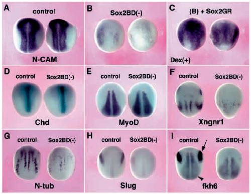 sequence to the carboxyl terminus of Sox2BD(-) (A, bottom). (B) N-CAM expression in animal caps neuralized with dnBMPR. Application of