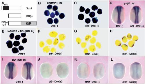 medium from stage 9 onwards (F), stage 12 (G) or stage 14 onwards (H). (I-L) 200 pg of Sox2BD(-)-GR mRNA was injected into each animal