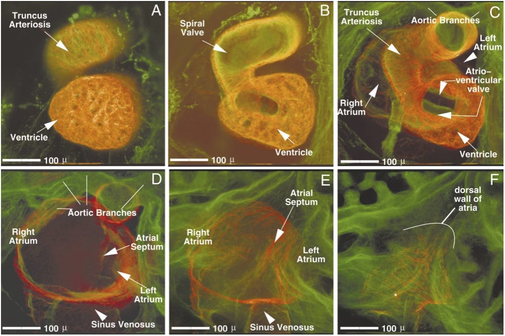 FIG. 5. Ventral-to-dorsal progression through a stage 46 Xenopus heart. Images were digitally created from a series of 48 optical sections (taken 5um apart) through a double-labeled stage 46 Xenopus heart (red, CT3; green, JB3). Image A represents the most ventral 8 images of this series, digitally merged; image B, the next 8, etc. The relative positioning of heart structures to one another, as well as an individual structure order of emergence within the series, can be established: the truncus arteriosus and ventricle are always most ventral (A). Progressing dorsally, the spiral valve (B) appears within the truncus. Next, the single atrioventricular valve (C) is seen overlying the atrial septum (D and E). Midway through the series (C and D), the first views of the atria, as well as the aortic branches, are viewed. Both atria and the sinus venosus are seen more dorsally (D and E). Finally, the back wall of the atria is seen, positioned most dorsal (F). Scale bar, 100 um.