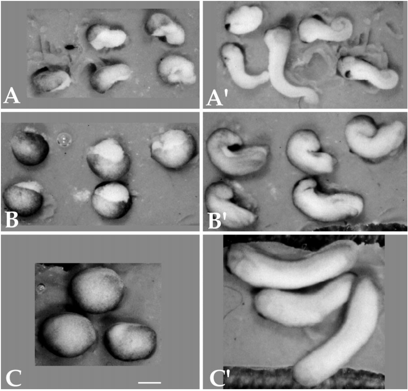 FIG. 2. Ventral explants lengthen autonomously. Photomicrographs of the same dorsal explants (A and A9), ventral explants (B and B9), and