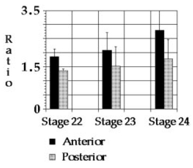 ratios increase posterior to anterior and in both regions with