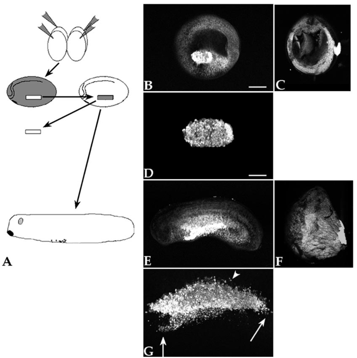 makes unlabeled cells of the host visible. Anterior is to the left and dorsal is up in B, D, E, and G. Dorsal is up in C and F. Scale bar in B