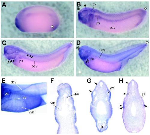 Figure 4. Spatial patterns of EphB4 gene expression during early Xenopus development. Whole-mount in situ hybridizations were performed to detect the distribution of EphB4 transcripts at different stages of embryonic development. Sections of stage 34 embryos (F) stained in whole mount were cut at 50 μm. Lateral views are shown in (A-E) with anterior to the left. Sections are oriented with anterior (F) and dorsal (G, H) to the top. (A) Expression of EphB4 transcripts at stage 23 was found in the developing head and at the posterior end (white arrowhead) of the embryo. (B) At stage 29, expression was detected in region of the developing forebrain (fb), at the midbrain-hindbrain boundary (arrowhead), around the otic vesicle (ov), and in the developing tailbud (white arrowhead). Expression was also detected in the developing pronephric sinus (ps) and posterior cardinal vein (pcv). Widespread faint staining was found throughout the head region. (C) Stage 34 embryo illustrating EphB4 expression in the developing vasculature. EphB4 expression was evident in the pronephric sinus (ps), the posterior cardinal vein (pcv), and in newly forming intersomitic veins (arrowhead). In addition, transcripts were found in the visceral arches (arrows). (D) Stage 39 embryo with EphB4 expression detected around the olfactory bulb (ob), the tip of the tail (white arrowhead), the dorsal caudal vein (dcv), and the developing external gills (arrows). (E) Expression of EphB4 detected in the trunk vasculature of a stage 41 embryo. The vascular vitelline network (vvn), the vitelline vein (vv), the dorsal caudal vein (dcv), and the pronephric sinus (ps) are indicated. (F) Horizontal section through the visceral arches. EphB4 expression is confined to subectodermal cell layers, and absent from the visceral arch mesenchyme (vm) and the pharyngeal endoderm (pe). (G) Transverse section through the head. Expression of EphB4 is detected in the inner layer of the ectoderm (arrows). No EphB4 transcripts could be detected in the developing heart (h) and otic vesicles (ov). (H) Transverse section through the embryonic trunk at the level of the pronephric kidney. EphB4 transcripts (arrow) were found in the vicinity of pronephric tubules (pt). The staining (arrowheads) seen in the somites (s) is associated with intersomitic veins.