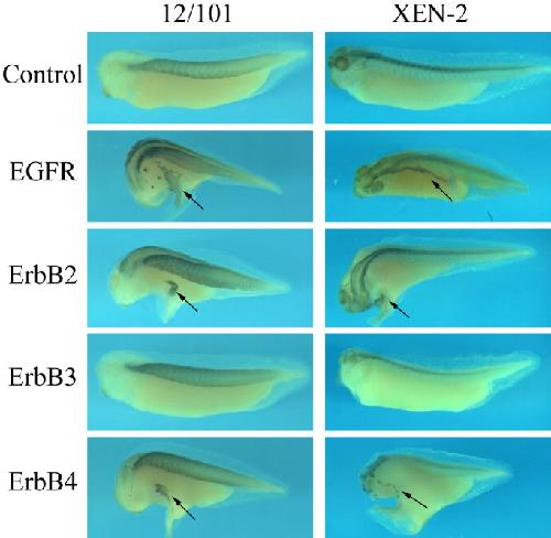Fig. 4. ErbBs promote expression of differentiated cell markers in the ectopic protrusions. Tadpoles injected with ErbBs (same as in Fig. 2) were analyzed with immunohistochemistry studies using antibodies against a muscle epitope (12/101) and a neural epitope (Xen2). In the ectopic structures induced by EGFR, ErbB2, and ErbB4, both markers were ex- pressed; the new sites of marker expression were often separated from the endogenous ex- pression domains, suggesting a de novo induc- tion of these differentiated genes in the protru- sions. Black arrows point to the ectopic structures |