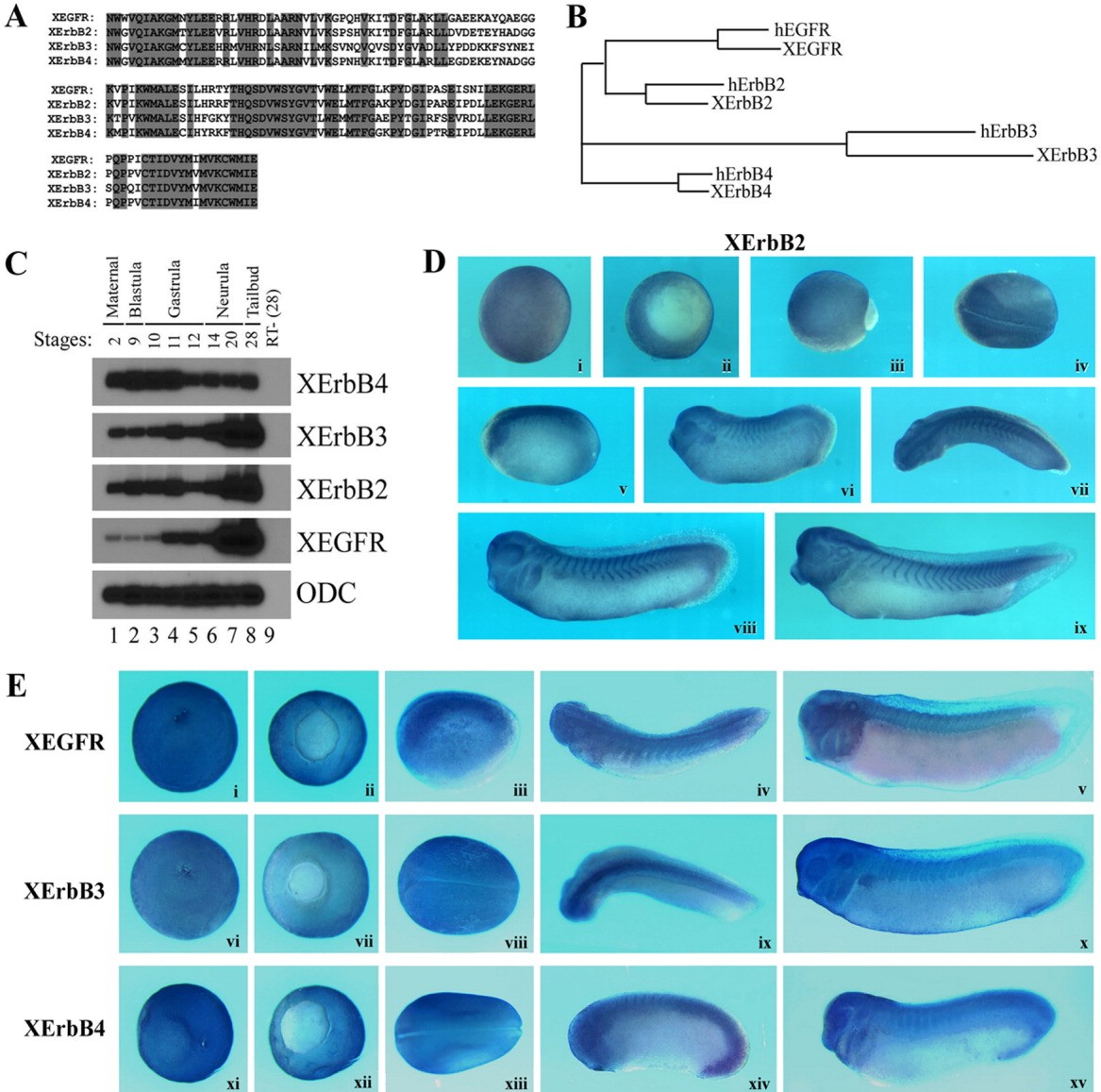 ErbB signaling has long been implicated in cancer formation and progression and is shown to regulate cell division, migration, and death during tumorigenesis. The functions of the ErbB pathway during early vertebrate embryogenesis, however, are not well understood. Here we report characterization of ErbB activities during early frog development. Gain-of-function analyses show that EGFR, ErbB2, and ErbB4 induce ectopic tumor-like cell mass that contains increased numbers of mitotic cells. Both the muscle and the neural markers are expressed in these ectopic protrusions. ErbBs also induce mesodermal markers in ectodermal explants. Loss-of-function studies using carboxyl terminal-truncated dominant-negative ErbB receptors demonstrate that blocking ErbB signals leads to defective gastrulation movements and malformation of the embryonic axis with a reduction in the head structures in early frog embryos. These data, together with the observation that ErbBs are expressed early during frog embryogenesis, suggest that ErbBs regulate cell proliferation, movements, and embryonic patterning during early Xenopus development.