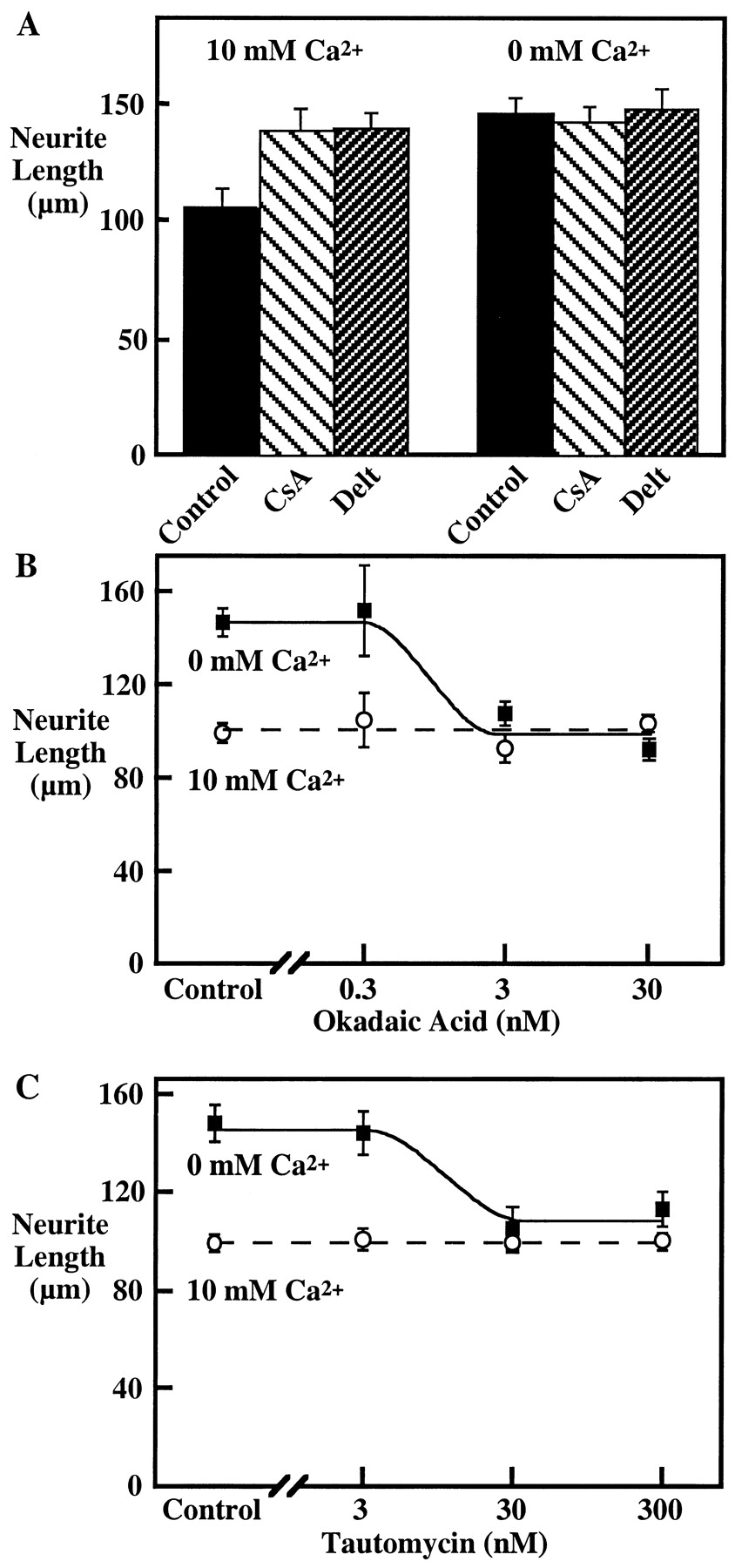 Pharmacological inhibition of CN but not other serâthr phosphatases increases neurite lengths in the presence of Ca2+. A, Neurite lengths are significantly increased by 10 nM CsA or 1 nM DM (Delt) in the presence of 10 mMCa2+. In the absence of extracellular Ca2+, inhibition of CN (PP2B) by 10 nMCsA or 1 nM DM has no effect on neurite lengths. Data are mean ± SEM (n ⥠100). B, OA at 300 pM, a concentration that does not inhibit members of the PP1 or PP2A families of protein phosphatases, has no effect on neurite length ± Ca2+. OA at 3 nM, which inhibits members of PP2A but not PP1, inhibits neurite lengths in the absence of Ca2+, suggesting that this family promotes neurite extension in the absence of waves. OA at 30 nM, which inhibits members of both PP2A and PP1, causes no further inhibition of neurite outgrowth. C, Taut at 3 nM, a concentration that affects only PP1 and not PP2A phosphatases, has no effect on neurite extension ± Ca2+. Taut at 30 and 300 nM, which inhibit members of both PP1 and PP2A, results in Ca2+-independent inhibition of neurite lengths. Data for B and C are mean ± SEM (n ⥠30). |
