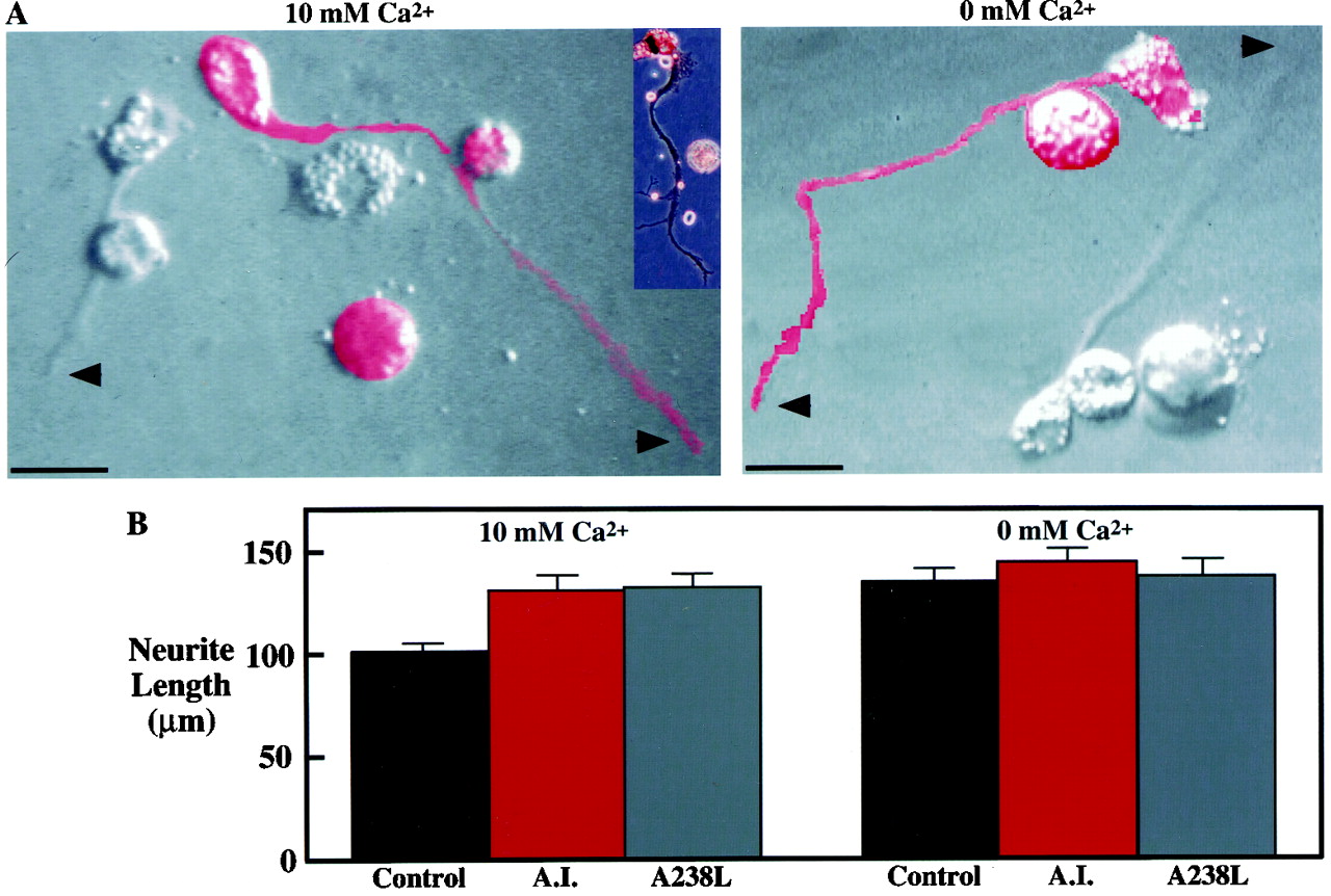 Peptide inhibition of CN increases neurite lengths in the presence of Ca2+. A,Myc-tagged xCN autoinhibitory domain (A.I.) cRNA was coinjected into one cell of a two-cell stage embryo with a fluorescent lineage tracer (rhodamine-dextran) to identifyA.I.-expressing cells. Nonfluorescent neurons serve as internal controls. Arrowheads indicate growth cones.Inset shows a myc-labeled neuron, demonstrating stability of the construct at 1 d in culture, is shown. Neurons were grown ±Ca2+. Scale bars, 25 μm.B, Neurite extension in the presence of external Ca2+ is significantly increased in cells expressingA.I. or the viral CN inhibitor A238L (p < 0.01). Neurons grown in the absence of Ca2+ and expressing A.I. or A238L have neurite lengths similar to those of controls. Data are mean ± SEM (n ⥠60). |