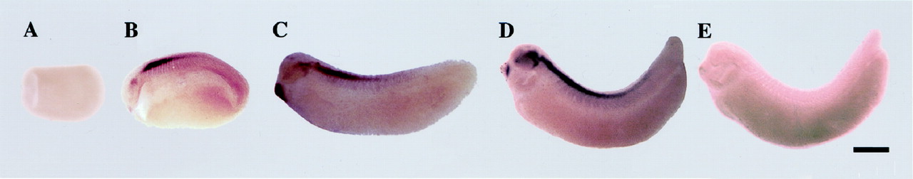 Developmental expression of Xenopuscalcineurin transcripts is visualized by in situhybridization of whole-mount albino Xenopus embryos with an xCN-specific antisense probe. A, xCN mRNA is not detected at the neural plate stage (stage 15). B,Message is first observed at the neural tube stage in the presumptive brain (stage 22). C, Transcripts are upregulated in the brain and spinal cord by the early tailbud stage (stage 26).D, Expression increases posteriorly as development progresses to the late tailbud stage (stage 32). E, A control tailbud stage embryo hybridized with xCN-specific sense probe does not reveal staining, indicating specificity of the antisense. For all embryos anterior is to the left, and dorsal isup. Scale bar, 500 μm. |
