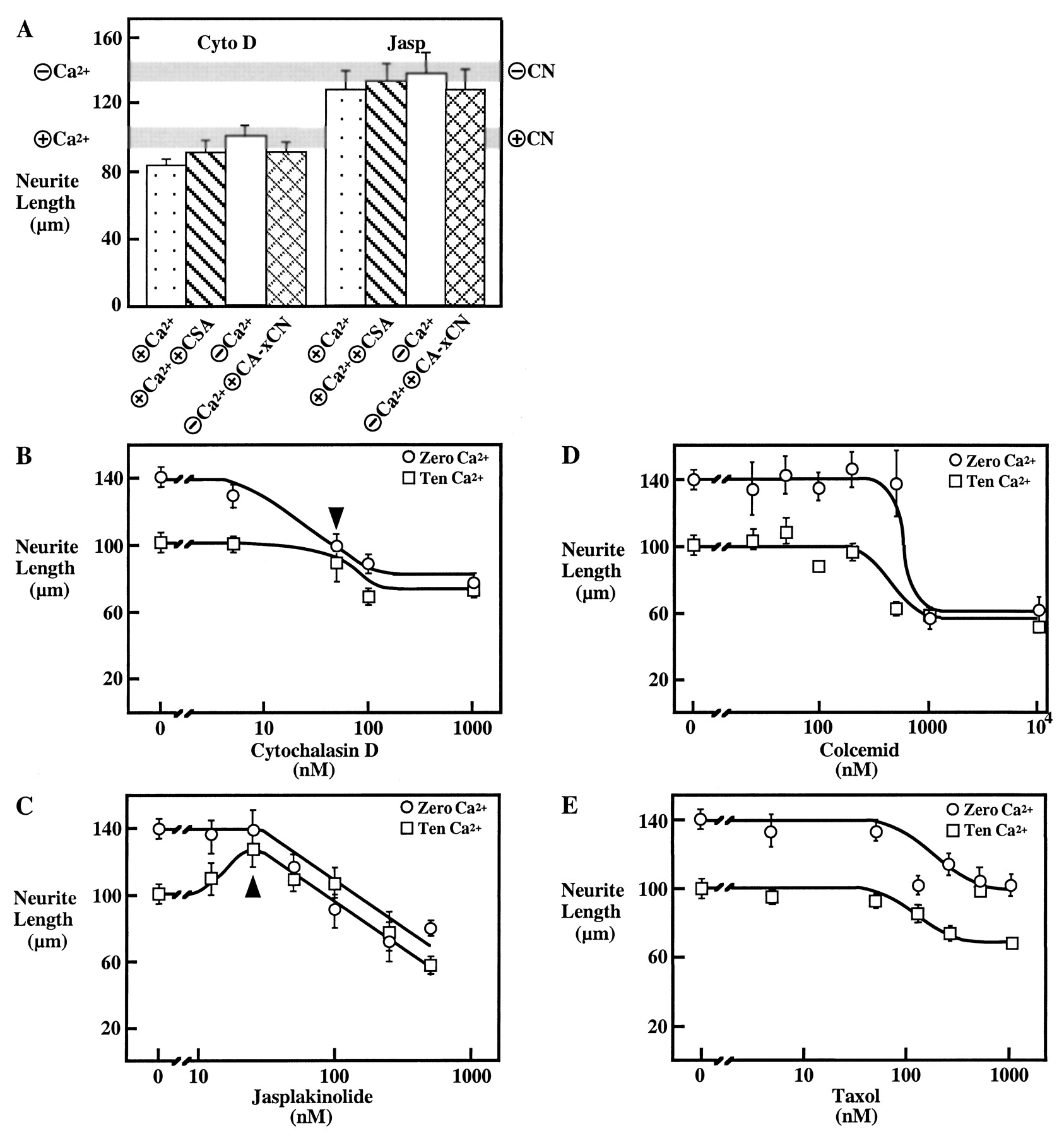 Disruption or stabilization of actin mimics the effects of activation or inhibition of CN. A, Shaded horizontal barsindicate neurite lengths in the presence of Ca2+ and CN activity and in their absence (see Fig. 1). Disruption of actin with Cyto D (50 nM) results in shorter neurites in the absence of CN activity, whereas stabilization of actin with Jasp (25 nM) generates longer neurites in the presence of CN activity. See text for further details. B,C, Doseâresponse analyses reveal the concentrations of Cyto D and Jasp (arrowheads) that mimic the effect of activating or inhibiting CN on neurite outgrowth. Disruption of actin filaments with Cyto D (50 nM; B) inhibits outgrowth in the absence of Ca2+ but not in its presence, whereas Jasp (25 nM; C) increases neurite lengths in its presence of Ca2+ but not in its absence. D, E, Doseâresponse analyses demonstrate that destabilization or stabilization of microtubules with colcemide (D) or taxol (E) results in a Ca2+-independent inhibition of neurite outgrowth. Data are mean ± SEM (n ⥠30).CSA, CsA. |