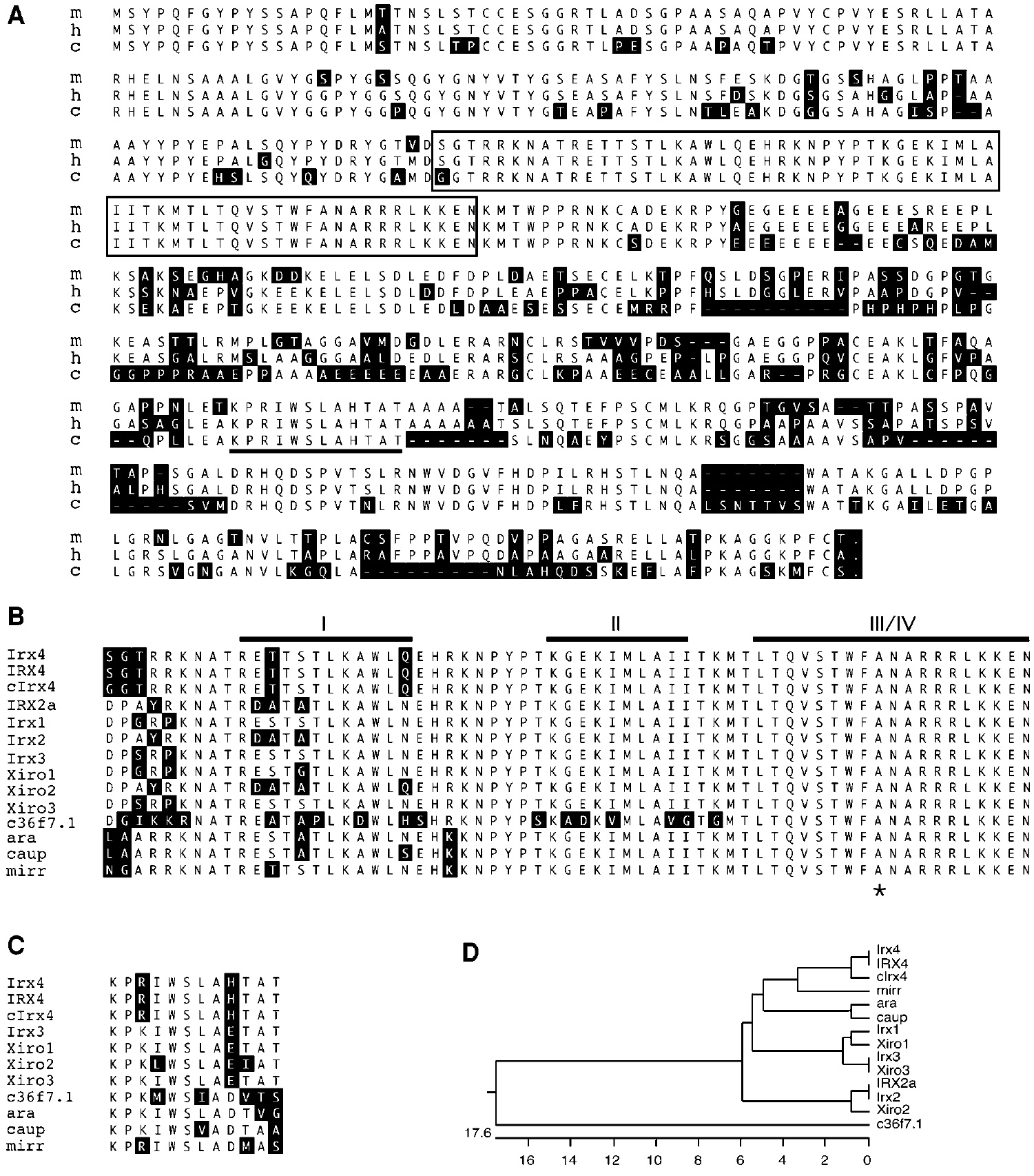 We report the isolation and characterization of the cDNAs encoded by the murine and human homeobox genes, Irx4 (Iroquois homeobox gene 4). Mouse and human Irx4 proteins are highly conserved (83%) and their 63-aa homeodomain is more than 93% identical to that of the Drosophila Iroquois patterning genes. Human IRX4 maps to chromosome 5p15.3, which is syntenic to murine chromosome 13. Irx4 transcripts are present in the developing central nervous system, skin, and vibrissae, but are predominantly expressed in the cardiac ventricles. In mice at embryonic day (E) 7.5, Irx4 transcripts are found in the chorion and at low levels in a discrete anterior domain of the cardiac primordia. During the formation of the linear heart tube and its subsequent looping (E8.0-8.5), Irx4 expression is restricted to the ventricular segment and is absent from both the posterior (eventual atrial) and the anterior (eventual outflow tract) segments of the heart. Throughout all subsequent stages in which the chambers of the heart become morphologically distinct (E8.5-11) and into adulthood, cardiac Irx4 expression is found exclusively in the ventricular myocardium. Irx4 gene expression was also assessed in embryos with aberrant cardiac development: mice lacking RXRalpha or MEF2c have normal Irx4 expression, but mice lacking the homeobox transcription factor Nkx2-5 (Csx) have markedly reduced levels of Irx4 transcripts. dHand-null embryos initiate Irx4 expression, but cannot maintain normal levels. These data indicate that the homeobox gene Irx4 is likely to be an important mediator of ventricular differentiation during cardiac development, which is downstream of Nkx2-5 and dHand.
