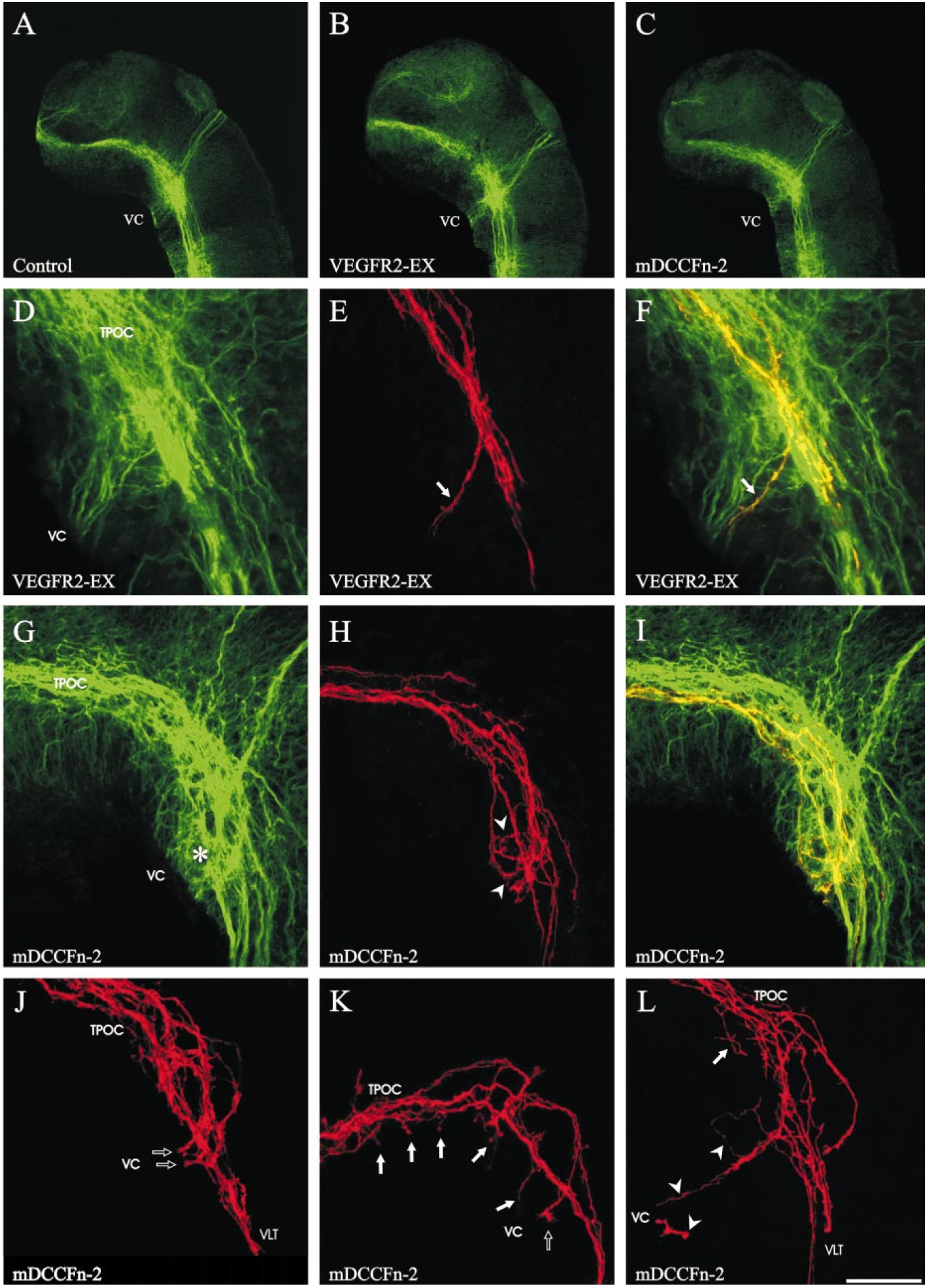 mDCCFn-2 (C) developed normally when immunostained for acetylated a-tubulin. (D–F) Brain exposed to VEGFR2-EX and double labeled