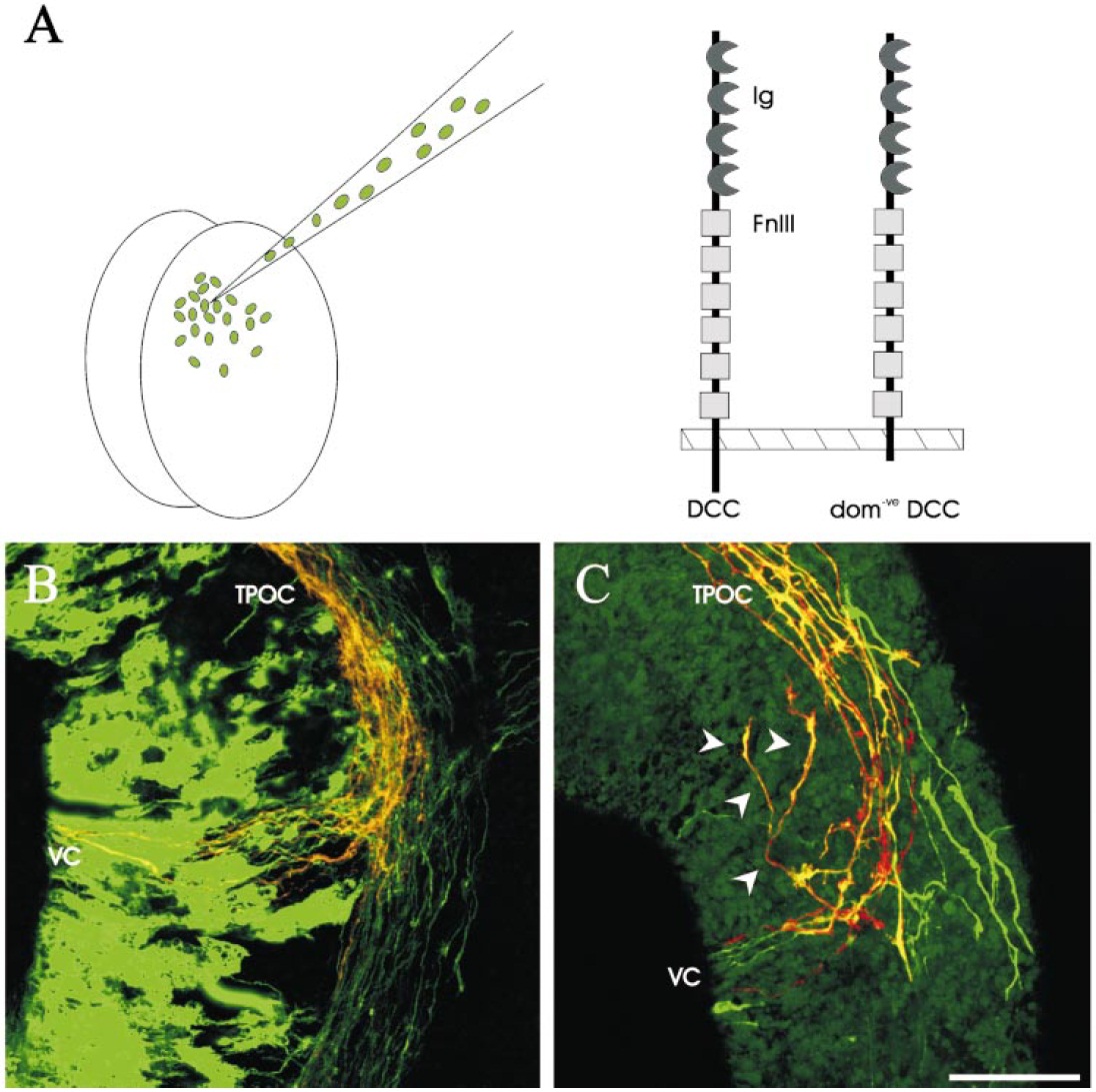 expressing dom2ve DCC (yellow axons) exited the TPOC but failed to cross the midline. Instead these axons turned about and grew back