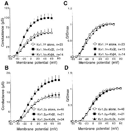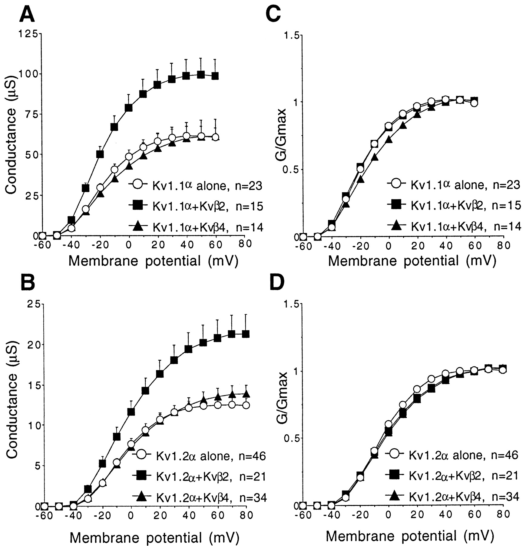 Coexpression of xKvβ2 versus xKvβ4 subunits differentially modulates steady-state activation properties of xKv1α channels. A, B, Conductance–voltage (G–V) relationships indicate that coexpression of either xKv1α subunit (A, xKv1.1α;B, xKv1.2α) with xKvβ2 subunits results in an increase in G max. In contrast, coexpression of xKv1α subunits with xKvβ4 has no significant effect onG max. C, D, NormalizedG–V curves for xKv1.1α (C) or xKv1.2α (D) currents obtained in the absence or presence of xKvβ subunits. Coexpression of xKv1.2α with either xKvβ2 or xKvβ4 subunits leads to a depolarizing shift in the G–Vrelationship (Table 2). In C, data obtained in the presence of xKvβ4 (▴) are statistically different from those obtained in its absence (○) in the range of −20 to +40 mV;p values range between 0.0001 and 0.006. InD, data obtained in the presence of xKvβ2 (▪) or xKvβ4 (▴) are statistically different from those obtained in its absence (○) in the range of +10 to +50 mV (xKvβ2) and 0 and 50 mV (xKvβ4); p values range between 0.0001 and 0.04. |