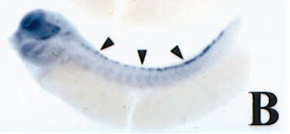 kcnab2 (potassium channel, voltage gated subfamily A regulatory beta subunit 2) gene expression in Xenopus laevis embryo, assayed via in situ hybridization, NF stage 24, lateral view, anterior left, dorsal up. |