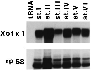 Fig. 1. RNase protection analysis of Xotx1 expression during oogenesis from stage I oocytes up to stage VI oocytes. The X. laevis gene for ribosomal protein S8 (rp S8) (Pierandrei-Amaldi et al., 1982; Mariottini et al., 1988) is analyzed as an internal standard.