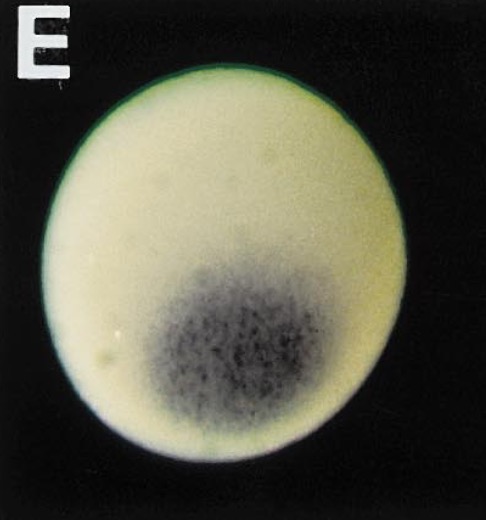 otx1 (orthodenticle homeobox 1) gene expression in Xenopus laevis embryo, assayed via in situ hybridization, oocyte stage IV, vegetal view.