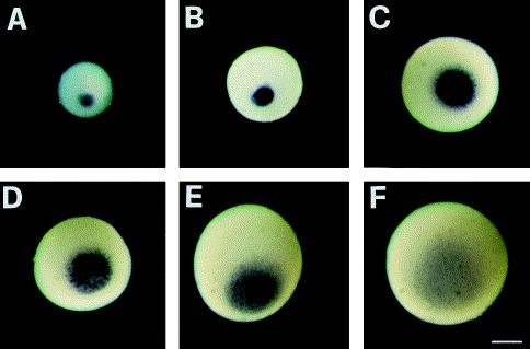 Fig. 2. Whole-mount in situ hybridization to oocytes of different stages showing the localized Xotx1 expression. (A) Stage II oocyte; (B ,C) early and late stage III oocyte; (DâF) early, mid and late stage IV oocyte. The bar in F represents 200 μm.