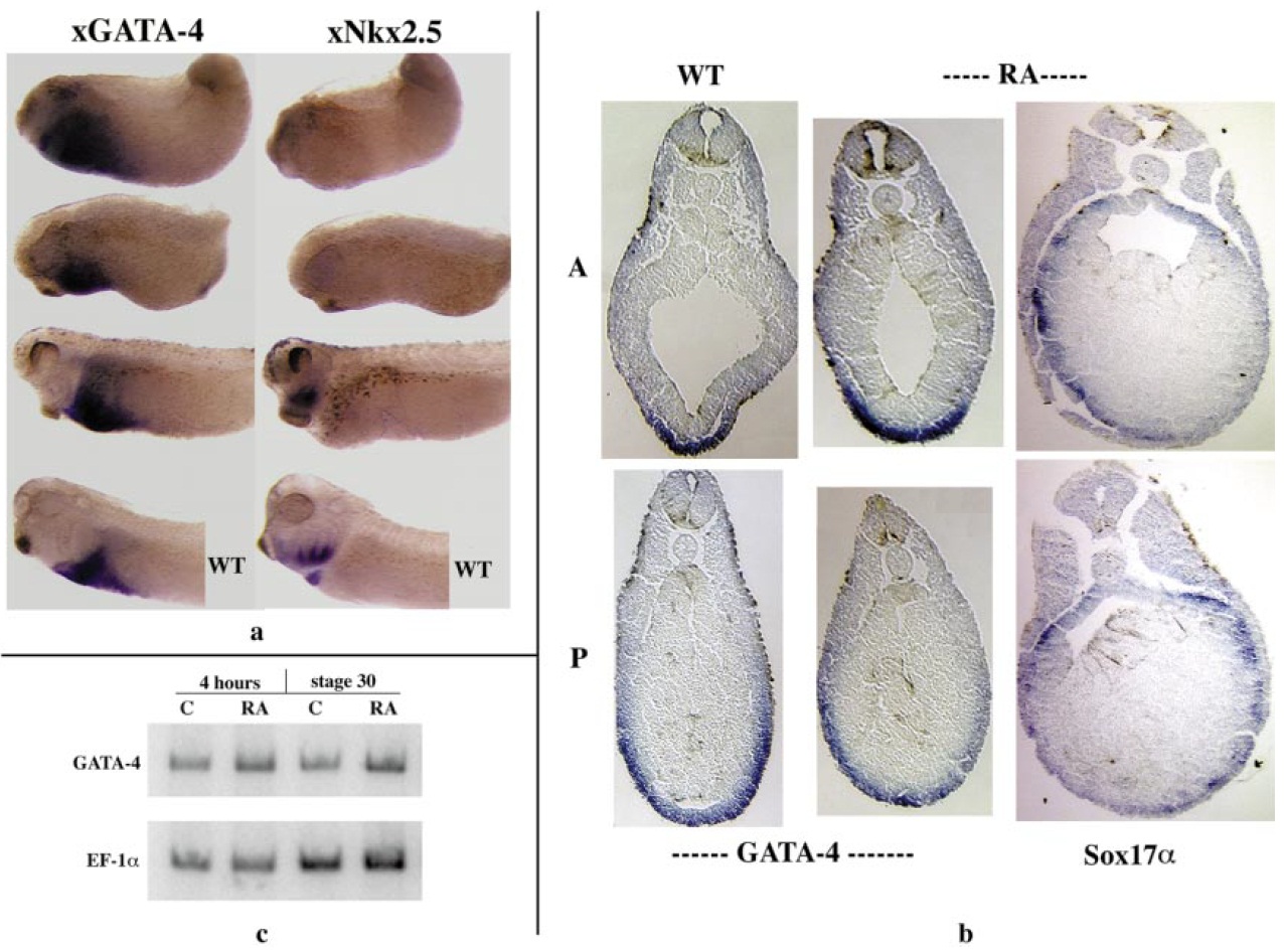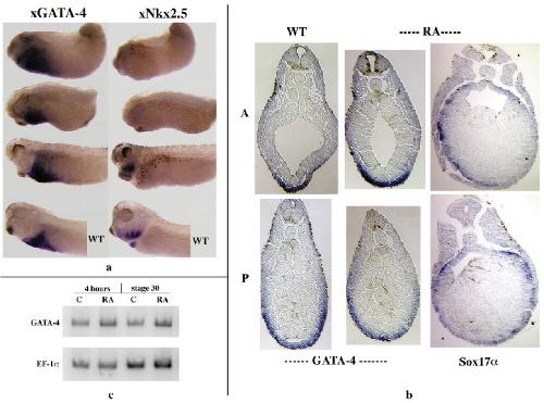 the control embryos (left), the GATA-4 transcript pattern is enhanced and expanded in the RA-treated embryos (middle). To confirm the