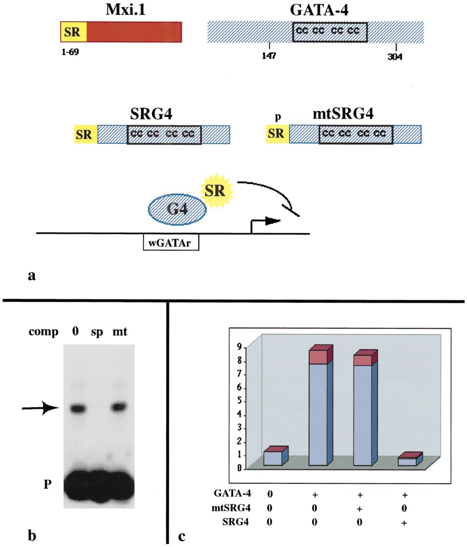 the domain structure of SRG4. The strong repression (SR) domain of Mxi.1 is fused to a region of GATA-4, containing both zinc fingers (cc