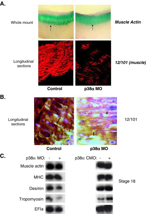 Fig. 5. Somite boundaries and myotube structure are disrupted in p38α-knockdown embryos. (A) Embryos (n = 15) were injected with p38α MO and cultured until they reached stage 25. Embryos were fixed and taken for whole-mount in situ hybridization for detecting muscle actin (upper panel). Somite patterning was observed on longitudinal sections immunostained with the 12/101 antibody and analyzed by confocal microscopy (lower panel) (n = 7). (B) Longitudinal sections of MO-injected and uninjected embryos (stage 25) were immunostained with the 12/101 antibody and analyzed under light microscopy (n = 6). Double arrows show myotube diameter. (C) 18 DLMZ explants were removed from each uninjected and p38α MO-injected embryos and cultured until sibling embryos reached stage 18 and RNA was isolated. RT-PCR analysis was preformed with primers to MHC, desmin, tropomyosin, muscle actin and EF1α serving as a control for quantifying RNA levels in the different samples. Control-RT PCR was performed (not shown). All injected embryos in panels A and B displayed similar phenotypes.
