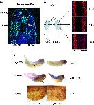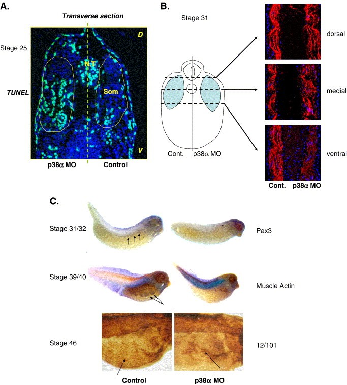 Fig. 6. The ventral portions of the somite undergo apoptotic cell death in tailbudp38-knockdown embryos. (A) Two-cell embryos were injected unilaterally into one blastomere with p38α MO (7.5 ng). Embryos were cultured to stage 25. Four embryos were transversely-sectioned and TUNEL analysis was performed followed by TRO-PRO3 staining. One sectioned embryo is shown. Similar results were obtained with all other embryos (n = 4). Cells undergoing apoptosis are stained in light blue. Approximate somite borders are schematically presented. Som. is somite and N.T is neural tube. (B) Two cell embryos (n = 5) were injected unilaterally with p38α MO (7.5 ng). Embryos were cultured to stage 31. Injected embryos were longitudinally sectioned at different dorso-ventral levels of the somites and immunostained with the 12/101 antibody (red staining) followed by TRO-PRO3 staining (blue staining). One sectioned embryo is shown. Similar results were obtained with all other embryos (n = 5). (C) Embryos were injected with p38α MO. Embryos were fixed and taken for whole-mount in situ hybridization to pax3 and muscle actin. Arrows point at migrating muscle progenitor cells. Embryos were injected with p38α MO and cultured to stage 46. Whole embryos were fixed, immunostained with the 12/101 antibody and analyzed by light microscopy. Arrows point at muscle cells (lower panel).