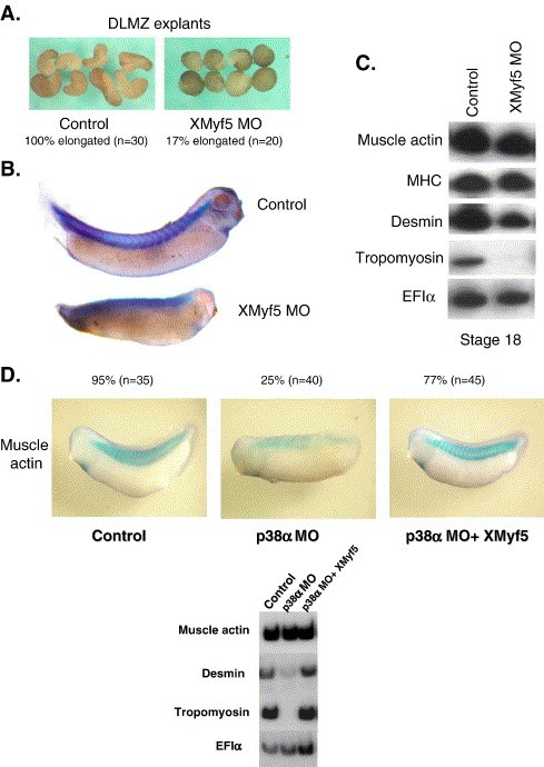 Fig. 7. Exogenous expression of XMyf5 rescues the phenotype of p38-knockdown embryos. (A) Embryos were injected with XMyf5 MO. DLMZ explants were dissected at stage 10.25 and cultured until sibling embryos reached early neurula stages. (B) Embryos were injected with XMyf5 MO and cultured to tadpole stage. Embryos were fixed and taken for whole-mount in situ hybridization using a probe of muscle actin. 95% of control embryos displayed segmental phenotype (n = 38). 92% of MO-injected embryos lost the segmented phenotype (n = 41). (C) Embryos were injected with the XMyf5 MO. 18 DLMZ explants were dissected at stages 10.25 and cultured until sibling embryos reached early neurula stages (stage 18). RNA was isolated and RT PCR analysis was performed with primers to MHC, desmin, tropomyosin, muscle actin and EF1α serving as a control for quantifying RNA levels in each sample. Control-RT PCR reactions were performed (not shown). (D) Embryos were injected with XMyf5-encoding RNA (0.8 ng), and p38α MO and cultured until control embryos reached stage 29/30. Embryos were fixed and analyzed by whole-mount in situ hybridization using the muscle actin probe (upper panel). Statistical analysis relates to the percentage of embryos displaying normal segmented phenotypes. Embryos were injected as described above. 18 DLMZ explants were dissected at stages 10.25 and cultured until sibling embryos reached early neurula stages (stage 18). RNA was isolated and RT PCR analysis was performed with primers to desmin, tropomyosin, muscle actin and EF1α (lower panel).