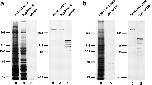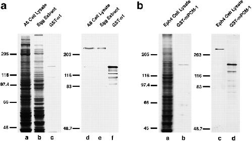 Figure 1. Specificity of pAbs. a, Rabbit anti–Xenopus PCM-1 (XPCM-1) pAb. Total cell lysate of cultured Xenopus A6 cells (A6 Cell Lysate) and Xenopus egg extract (Egg Extract), and purified GST fusion protein with the COOH-terminal portion of XPCM-1 produced in E. coli (GST-n1) were separated by SDS-PAGE (a–c; CBB staining), followed by immunoblotting with anti–XPCM-1 pAb (d–f). This affinity-purified pAb specifically recognized ∼230 kD XPCM-1 in d and e, as well as GST fusion protein in f. b, Rabbit anti–mouse PCM-1 (mPCM-1) pAb. Total cell lysate of cultured mouse Eph4 cells (Eph4 Cell Lysate) and purified GST fusion protein with the COOH-terminal portion of mPCM-1 produced in E. coli (GST-mPCM-1) were separated by SDS-PAGE (a and b; CBB staining), followed by immunoblotting with anti–mPCM-1 pAb (c and d). This affinity-purified pAb specifically recognized ∼230 kD mPCM-1 in c, as well as GST fusion protein in d. |