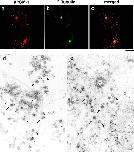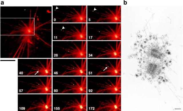 Figure 4. In vitro motility of GFP-tagged centriolar satellites. a, Time-lapse observation of the movement of a centriolar satellite (green) in a reconstituted aster (red). The boxed area in the large panel is magnified in the small panels. Numbers at the bottom left in the small panels indicate the time lapse in seconds. GFP-tagged centriolar satellite (arrowheads) moved along a MT toward centrosomes where other granules had already accumulated. On the way to the centrosome, this granule changed MTs (arrows), and finally reached the centrosome. Bar, 10 μm. A QuickTime movie is available at http://www.jcb.org/cgi/content/147/5/969/F4/DC1. b, Immunoelectron microscopy of centriolar satellites accumulating around centrosomes in the in vitro reconstituted asters. Electron-dense granular structures, ∼80–90 nm in diameter, which were specifically labeled with anti–XPCM-1 pAb (10-nm gold particles), were accumulated around fibrous materials of centrosomes. These XPCM-1–containing granules were not delineated by membranes. Bar, 200 nm. |