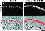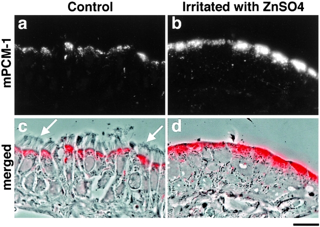 Figure 6. Subcellular distribution of mouse PCM-1 (mPCM-1) in mouse nasal respiratory epithelium. When cryosections ∼0.5-μm thick of ciliated epithelium were immunofluorescently stained with anti–mPCM-1 pAb (a, red in c), mPCM-1 signal was detected at the apical cytoplasm of epithelial cells (c; a composite with the phase-contrast image). Arrows, cilia. At four days after irritation of the nasal epithelia with 1% aqueous ZnSO4 in situ, cilia were completely removed from their apical surface, and the PCM-1 signal at the apical cytoplasm was markedly elevated (b, red in d). d, a composite with the phase-contrast image. Bar, 10 μm. |