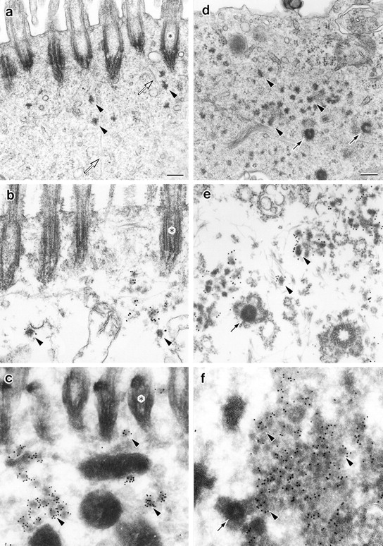 Figure 7. Localization of mPCM-1 in nasal respiratory epithelial cells at four days after exposure to distilled water (a–c) or irritation with 1% aqueous ZnSO4 (d–f). a, Conventional ultrathin EM. Electron-dense spherical granules (arrowheads), ∼70–100 nm in diameter, which were morphologically indistinguishable from centriolar satellites, were scattered close to ciliary basal bodies (asterisks). Open arrows, microtubules. b, Preembedding immunoelectron microscopy. Nasal epithelial tissues were treated with 0.5% Triton X-100, fixed with glutaraldehyde, then labeled with anti–mPCM-1 pAb. The centriolar satellite-like granules were specifically labeled (arrowheads). c, Postembedding immunoelectron microscopy. Ultrathin cryosections of nasal epithelial cells were labeled with anti–mPCM-1 pAb. The centriolar satellite-like granules were specifically labeled (arrowheads). d, Conventional ultrathin EM. Cilia were completely removed, and at the apical cytoplasm numerous fibrous granules (arrowheads), as well as deuterosomes (arrows), appeared. e, Preembedding immunoelectron microscopy. Samples were treated with 0.5% Triton X-100, fixed with glutaraldehyde, then labeled with anti–mPCM-1 pAb. Fibrous granules (arrowheads), but not deuterosomes (arrow), were heavily labeled. Both centriolar and acentriolar pathways for centriolar replication were observed (see details in the text). f, Postembedding immunoelectron microscopy. Ultrathin cryosections were labeled with anti–mPCM-1 pAb. Fibrous granules (arrowheads), but not deuterosomes (arrow), were specifically labeled. Bars, 200 nm. |