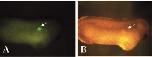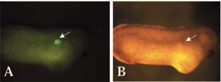 Fig. 4. Lineage-labelled orthotopic grafts from the intermediate mesoderm in the presumptive pronephric region contribute to the developing pronephros. Embryos were injected with the lineage label FLDX at the 1-cell stage and allowed to develop to stage 12.5. Grafts were taken from the middle intermediate mesoderm explant from stage 12.5 embryos, as described in Fig. 1, and inserted into host embryos of the same stage at an equivalent position. The grafted embryos were allowed to develop until stage 28 and then observed under a Leica MXFLIII UV dissecting microscope. Images were captured using a Leica DC100 video camera.