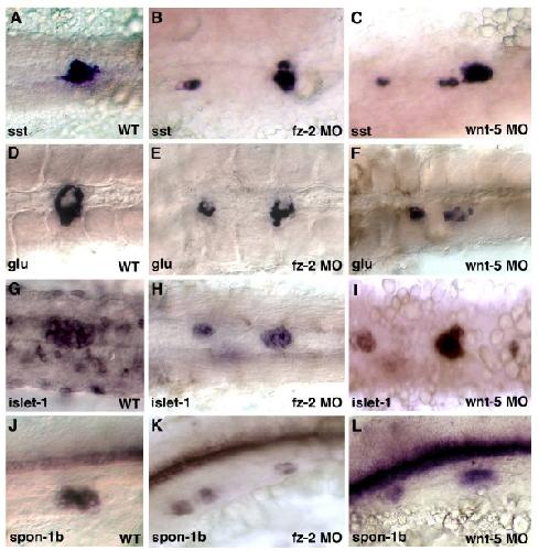 Figure 5. Wnt-5 and Fz-2 morphant embryos exhibit similar pancreatic islet defects at 24 hpf. In all panels, anterior is to the left and 24 hpf. .A-I, dorsal view; J-L, lateral view. (A, D, G, J) Wild-type embryos. (B, E, H, K) Fz-2 morphants. (C, F, I, L) Wnt-5 morphants. In situ hybridization analysis of (A, B, C) somatostatin, (D, E, F) glucagon, notice a hollow spot in the middle of each patch, (G, H, I) islet-1, (J, K, L) fspondin-2b. Note scattered pancreatic cells in Fz-2 and Wnt-5 morphants. |