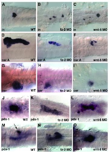 Figure 6. Wnt-5 and Fz-2 morphant embryos have other similar defects. In all panels, view is dorsal, anterior is to the left. (A-I, M-O) 3dpf, (J-L) 24 hpf stage. (A, D, G, J, M) Wild-type embryos. (B, E, H, K, N) Fz-2 morphants. (C, F, I, L, O) Wnt-5 morphants. In situ hybridization analysis of (A-C) insulin, (D-F) carboxypeptidase A, notice the hollow spot indicating the position of the islet, (G-I) ceruloplasmin, (J-O) pdx-1, (M) arrow, pdx-1-staining in islet. |