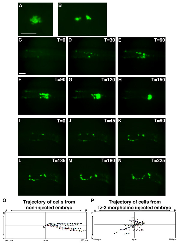 Figure 1. Time-lapse imaging of insulin:GFP transgenic embryos shows cell migration defects in Fz-2 morphants. (A, C-H) Uninjected insulin:GFP transgenic embryo, (B, I-N) fz-2 MO-injected insulin:GFP transgenic embryo. All panels are dorsal views and anterior is to the left. Scale bar represents 100 μm. (A) Uninjected transgenic embryo, 24 hpf. (B) Fz-2 MO-injected transgenic embryo, 24 hpf. (C) At the 14-somite stage, bilateral patches of GFP-positive cells are visible in uninjected embryo. (D) At the 15–16 somite stage, GFP-positive cells have started proliferating. (E-G) At the 17 somite to 24 hpf stages, GFP-positive cells are aligned in bilateral rows of cells and undergo a medial and posterior migration. (H) At 24 hpf, all GFP-positive cells have merged to form one islet. (I) At the 14-somite stage, bilateral patches of GFP expression are apparent in fz-2 MO-injected embryos similar to uninjected embryos. (J-M) GFP-positive cells migrate in random directions in fz-2 morphant embryos. (N) At 24 hpf, GFP-positive cells have still not merged. (O) Trajectory of GFP-positive cells in uninjected insulin:GFP embryo. Notice that cells are uniformly moving posteriorly. (P) Trajectory of GFP-positive cells in fz-2 MO-injected insulin:GFP embryo. Notice cells are moving in random directions. A: anterior, P: posterior, T: time, L: left, R: right, O: origin. |
