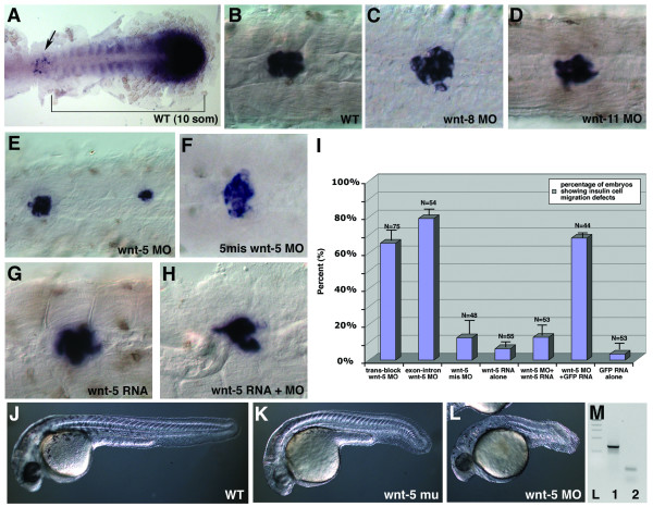 Figure 3. Wnt-5 has a specific role in islet formation. (A) Double in situ hybridization with pdx-1 and wnt-5, 10 som stage, dorsal view, the anterior is to the left. Arrow, pdx-1 expression, bracket, wnt-5 expression. (B-H) In situ hybridization with insulin at 24 hpf. (B) wild-type, (C) WNT-8 morphant embryos, (D) WNT-11 morphant embryos, (E) WNT-5 morphant embryos, (F)wnt-5 mismatch MO-injected embryos, (G) wnt-5 RNA injected embryo, (H) wnt-5 MO and wnt-5 RNA co-injected embryo. Notice the compact islet in this embryo that displays an undulated notochord. (I) Percentage of embryos with scattered insulin expression resulting from injection of wnt-5 MO reduced significantly from 60% to 10% when wnt-5 RNA was co-injected with wnt-5 MO. (J-L) Morphology at 24 hpf, (J) wild-type, (K) wnt-5 insertional mutant, (L) wnt-5 translation-blocking MO-injected embryos. Notice that wnt-5 MO injected embryos have more severe morphological phenotype than wnt-5 insertional mutant embryos. (M) RT-PCR analysis of wnt-5 transcript in wnt-5 exon-intron MO injected embryos. Injection of wnt-5 exon-intron MO results in severely shortened wnt-5 transcript. L:ladder, 1:EF-1α control, 2:wnt-5. |
