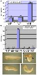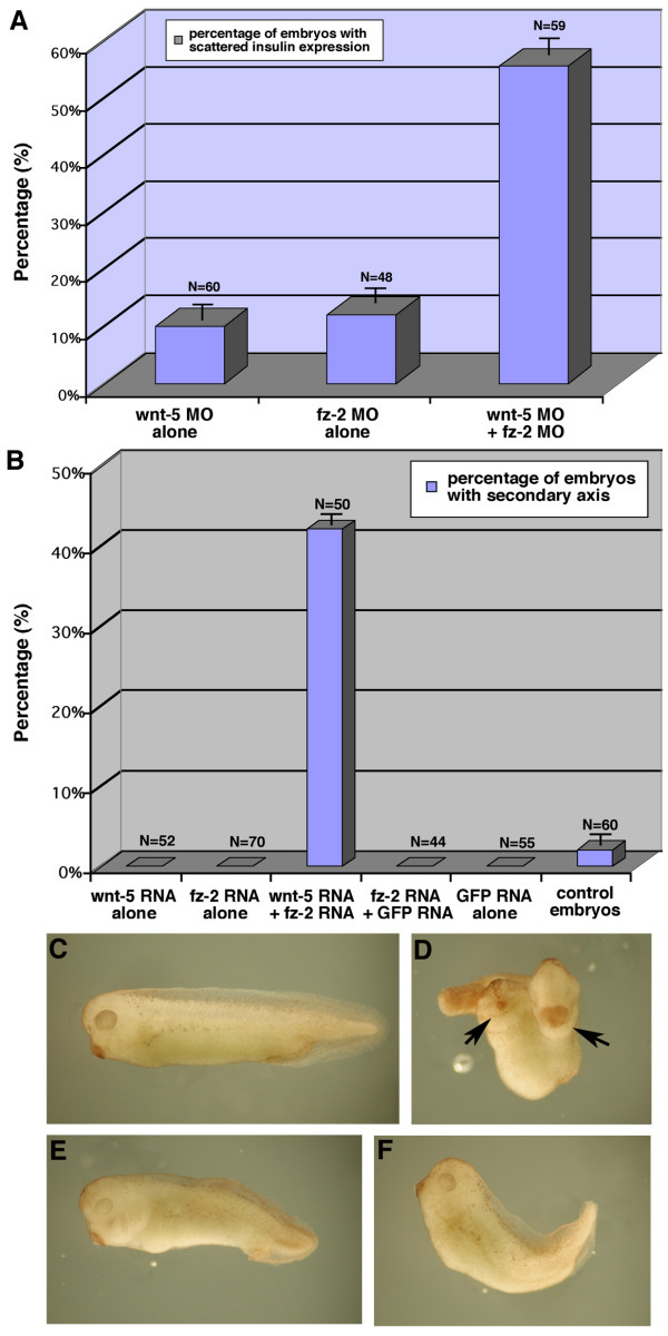 Figure 7. Wnt-5 and fz-2 are in the same signaling pathway. (A) Injection of either wnt-5 MO or fz-2 MO mix results in less than 10% of embryos with scattered insulin expression. Co-injection of wnt-5 and fz-2 MOs results in 50% of embryos with defects. (B) Injection of either wnt-5 mRNA or fz-2 mRNA did not cause secondary axis in Xenopus embryos, whereas co-injection with both mRNAs resulted in 40% of embryos with secondary axis. Control injections of GFP mRNA alone or together with fz-2 mRNA resulted in no embryos with secondary axis. (C-F) Xenopus embryos, tailbud stage, (C) wild-type, (D) wnt-5 and fz-2 mRNA co-injected, black arrows-point to the primary and secondary hatching glands, (E) wnt-5 mRNA injected, (F) fz-2 mRNA injected. |