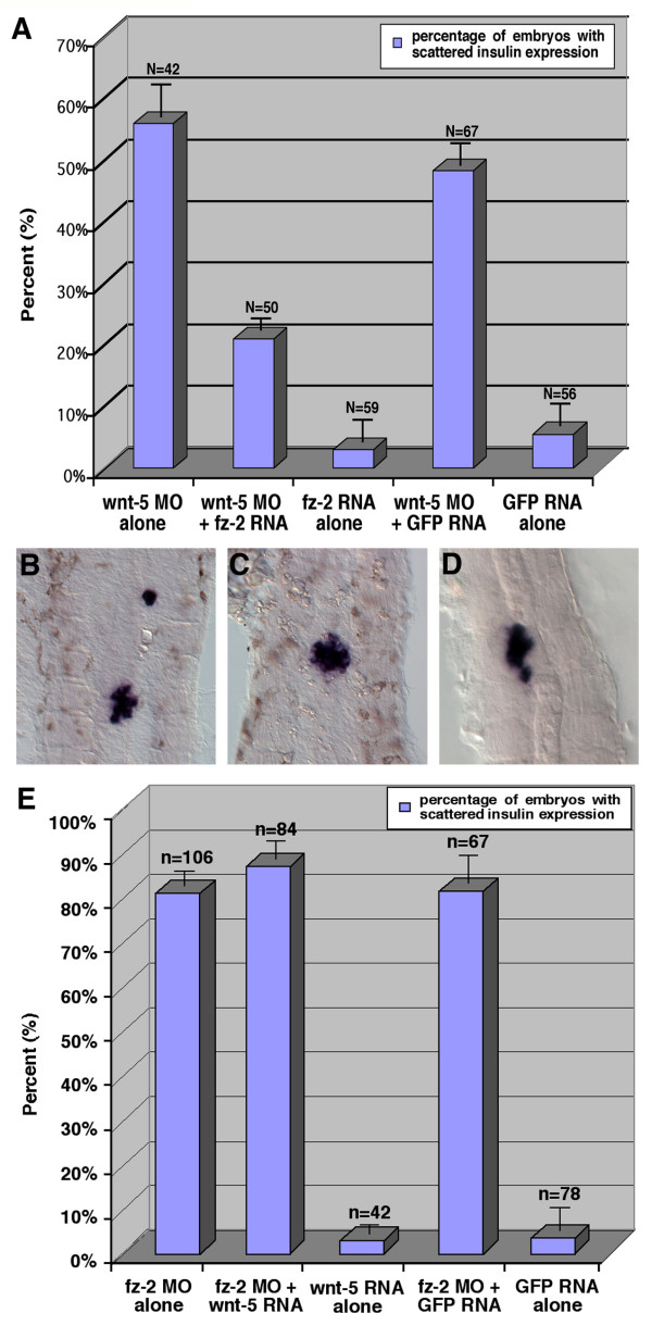 Figure 8. Wnt-5 acts genetically upstream of fz-2. (A) Injection of wnt-5 MO alone results in 50% embryos with insulin cell defect. Injection of fz-2 mRNA results in 5% embryos with insulin cell defects. Co-injection of wnt-5 MO and fz-2 mRNA results in 20% of embryos with abnormal insulin expression. In a control experiment, co-injection of wnt-5 MO and GFP mRNA results in 45% of embryos with defects. (B-D) Insulin expression as analyzed by in situ hybridization at 24 hpf, (B) wnt-5 MO injected, (C) fz-2 RNA injected, (D) wnt-5 MO- and fz-2 RNA-injected embryos. Note that fz-2 mRNA rescues insulin cell migration defect in wnt-5 morphants. (E) Same dose of wnt-5 mRNA that can rescue the insulin cell migration defects in wnt-5 morphants cannot rescue the defects in fz-2 morphants. |