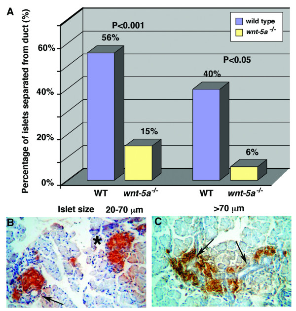 Figure 10. Wnt5a-/- islets remain in ductal proximity and have a streaked appearance at E18.5. (A) In Wnt5a-/- embryos, most islets are associated with ducts. Both small and large β-cell aggregates are more frequently associated with pancreatic ducts in Wnt5a-/- embryos at E18.5 than in wild-type embryos. (B, C) Insulin antibody staining. (B) Round and compact islets in wild-type embryos. A normal pancreas consists of islets that are associated and separated from ducts. Arrows: pancreatic duct, asterisk: an islet separated from duct. (C) Streak-like, fragmented islets in Wnt5a-/- mutant embryos. |