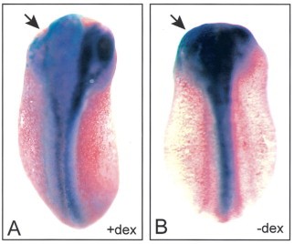 Dex-treated embryos display a loss of neural tissue (A; b-gal staining,