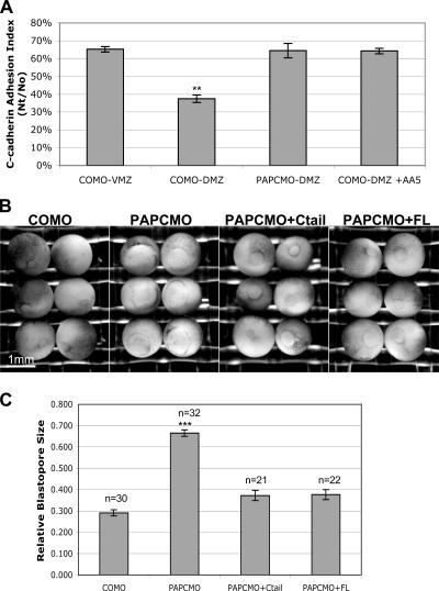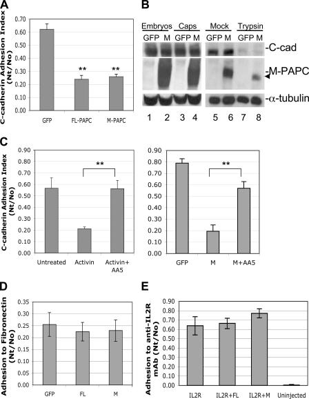 Little is known about how protocadherins function in cell adhesion and tissue development. Paraxial protocadherin (PAPC) controls cell sorting and morphogenetic movements in the Xenopus laevis embryo. We find that PAPC mediates these functions by down-regulating the adhesion activity of C-cadherin. Expression of exogenous C-cadherin reverses PAPC-induced cell sorting and gastrulation defects. Moreover, loss of endogenous PAPC results in elevated C-cadherin adhesion activity in the dorsal mesoderm and interferes with the normal blastopore closure, a defect that can be rescued by a dominant-negative C-cadherin mutant. Importantly, activin induces PAPC expression, and PAPC is required for activin-induced regulation of C-cadherin adhesion activity and explant morphogenesis. Signaling through Frizzled-7 is not required for PAPC regulation of C-cadherin, suggesting that C-cadherin regulation and Frizzled-7 signaling are two distinct branches of the PAPC pathway that induce morphogenetic movements. Thus, spatial regulation of classical cadherin adhesive function by local expression of a protocadherin is a novel mechanism for controlling cell sorting and tissue morphogenesis.