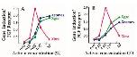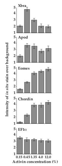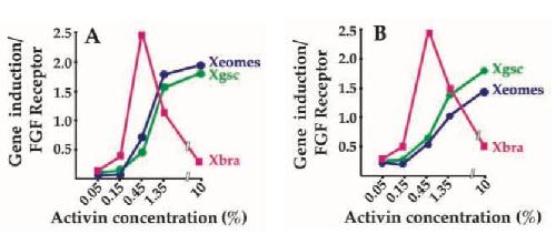 Fig. 3. Graphic representation of gene activation response to activin concentration, for (A) low density and (B) reaggregated cell cultures. The values shown were obtained by phosphorimager assessment of gel analyses by RNase protection. B is taken from Dyson and Gurdon (1998, with permission), since the results shown in A and B are from the same experimental series. Comparable results were obtained in two other experimental series.