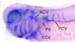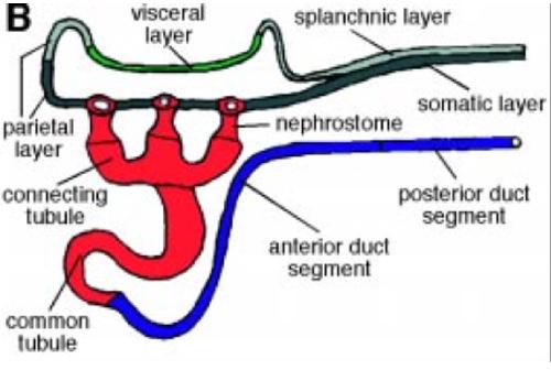 Fig. 1. Basic organization of the Xenopus pronephric kidney. (B) Segmental organization of pronephric nephrons. The pronephric capsule is comprised of visceral and parietal epithelia. The visceral (or podocyte) layer (green) is a specialized segment of the splanchnic mesoderm. It contacts the vasculature of the glomus and is continuous with the epithelium of the parietal layer. Pronephric tubules (red) are subdivided into nephrostomes, connecting tubules, and the common tubule. Finally, the pronephric duct (blue) is comprised of at least two parts, the anterior and posterior duct segments. Abbreviations: acv, anterior cardinal vein; ccv, common cardinal vein; pcv, posterior cardinal vein. |
