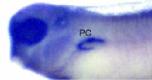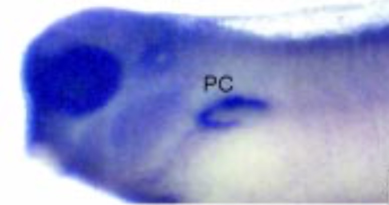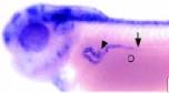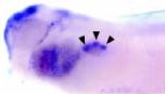 In the developing pronephric kidney, expression is largely restricted to the nephrostomes (arrow heads), as well as the brain, trigeminal nerve and pharyngeal region. |