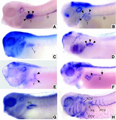 Fig. 3. Selected examples of marker gene expression in the developing Xenopus pronephric kidney. Lateral views are shown anterior to the right. Transcripts were detected by wholemount in situ hybridization. (A) Pax-8, stage 32. Expression is detected in the emerging pronephric tubules (arrowheads) and at reduced levels in the pronephric duct. (B) Pax-2, stage 36. All epithelia of the pronephric kidney including the nephrostomes (arrowheads) are stained. (C) Delta-1, stage 30. Staining is confined to the developing pronephric tubule anlage. (D) Wnt-4, stage 32. Expression is largely restricted to the nephrostomes (arrowheads). (E) Iro-3, stage 36. Transcripts are present in the common tubule only. Anterior (arrowhead) and posterior (arrow) ends of the expression domain are indicated. (F) Sal-1, stage 38. Expression is found in the common tubule (arrowhead) and the anterior segment of the pronephric duct (arrow indicates posterior end of the expression domain). (G) WT-1, stage 30. Staining is evident in the pronephric capsule. (H) Msr, stage 34. Staining marks the developing vasculature. The major blood vessels in the region of the pronephric kidney are indicated. In situ hybridization and photography was performed as described elsewhere (Heller and Brändli, 1997, 1999). Abbreviations: ACV, anterior cardinal vein; CCV, common cardinal vein; D, pronephric duct; PC, pronephric capsule; PCV, posterior cardinal vein; PS, pronephric sinus; T, pronephric tubules. |