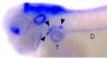 gene expression in seen in the pronephric mesenchyme, which will develop into the pronephric tubules (T), as well as CNS and head tissues. |