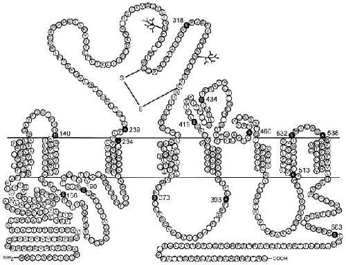 Figure 1. Topological representation of the rat type IIa sodium phosphate cotransporter (rat NaPi-IIa). Scheme is based on current hydropathy data and a recent topology study (Lambert et al. 1999) in which eight membrane spanning regions (TM1–TM8) are predicted with extracellular loops between TM1–TM2, TM3–TM4, TM5–TM6, and TM7–TM8, and both the carboxy and amino termini are intracellular. (•) Positions of 15 residues that were individually mutated to cysteines (see methods and materials). |