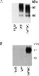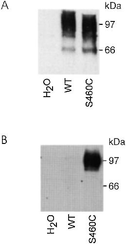 Figure 3. Immunodetection of WT and S460C protein. (A) Western blot obtained from a pool of five oocytes injected either with water, WT, or S460C cRNA. 10 μl of the lysates was separated on a 9% SDS gel and, after blotting, immunoreactive proteins were visualized by incubation with an antibody against the rat NaPi IIa NH2 terminus. This blot confirms that lysate from oocytes expressing S460C presents a similar band (97 kD) to the WT. (B) Streptavidin precipitation of oocyte lysate obtained from pools of five oocytes injected either with water, wild type, or S460C cRNA and incubated with 100 μM MTSEA-Biotin. Cells were then homogenized in 100 μl buffer (see materials and methods) and 90 μl of each lysate was incubated with Streptavidin beads. After washing, bound proteins were eluted with loading buffer (see materials and methods) and the elute was then treated as for A. Single band at 97 kD confirms that the alkylated protein was S460C. |